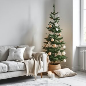 The Christmas tree in a Scandi hygge home is usually slender and elegant, decorated with handmade wooden ornaments, paper stars, dried citrus, and simple white lights. In 2026, people are adding small hand-dipped beeswax candles clipped to branches for a truly traditional Nordic nod, though battery-operated versions work just as beautifully for safety. The base of the tree is often wrapped in a simple sheepskin or white linen cloth, and small wrapped gifts in brown kraft paper tied with twine become part of the display. Everything feels handmade and considered. There is nothing mass-produced looking about this space — and that is entirely the point.