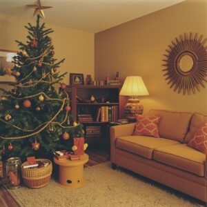 The rest of the room should commit to the era. A low-slung sofa in a warm caramel bouclé or mustard corduroy becomes the anchor. A sunburst mirror above the fireplace, a shag rug in camel or rust, and a collection of vintage-style ceramic candle holders on the mantel all contribute to the aesthetic. Macrame wall hangings with small woven holiday motifs can replace traditional garlands on a bare wall. For lighting, floor lamps with cone-shaped amber shades cast the most beautiful 70s-era glow across the whole space. This is the Christmas aesthetic that makes people stop their scroll and say, “Wait — I need to try this.”