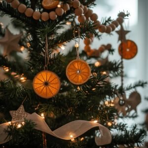 These slices pair beautifully with cinnamon sticks, dried rosehips, and bay leaves in a garland. The warm amber tones of the oranges complement both traditional red-and-green color schemes and more modern neutral palettes with cream, sage, and terracotta. Hang the garland across a window where natural daylight will backlight the slices, or drape it along a bookshelf alongside candles and greenery. On the Christmas tree, orange ornaments look especially beautiful on a tree decorated with kraft paper stars, wooden beads, and linen ribbon — a natural, slow-living aesthetic that feels warm and completely handmade. The faint citrus scent they release near a heat source is an added sensory bonus.