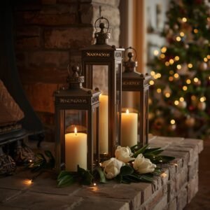 Lanterns are one of the most versatile and atmospheric elements in holiday decorating — they transition effortlessly from the front porch to the living room to the dining table. For a DIY take, pick up plain metal or wooden lanterns in varying sizes at thrift stores or discount home goods shops and give them a personalized makeover. Spray paint them in matte black, antique bronze, or aged white for a cohesive set. Place LED pillar candles or real candles inside each one and arrange them in a cluster of three or five on your porch, fireplace hearth, or at the base of your staircase. The varying heights are what create the visual drama — use a tall lantern, a medium one, and a small one together for a naturally balanced grouping.