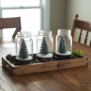 Mason jar snow globes have a quiet kind of magic to them. They sit on a table and catch the light in a way that makes guests stop and look twice. To make your own, all you need are wide-mouth mason jars, distilled water, a small amount of glycerin (which slows the fall of the “snow”), waterproof glue, and your choice of miniature figurines or bottlebrush trees. Glue your figurines to the inside of the lid, let it cure completely, then fill the jar with the water-and-glycerin mixture before adding white glitter or fake snow flakes. Seal the lid tightly and flip it upside down. The result is a charming little world inside glass that costs almost nothing to make.