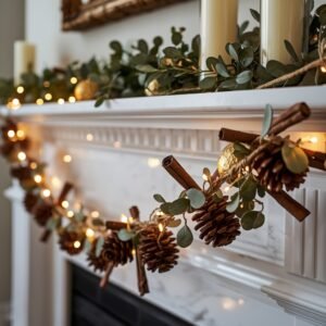 Drape your finished garland across the mantel and anchor it with a few chunky pillar candles in cream or deep red. Add a string of warm brass fairy lights woven through the garland for evening ambiance. If your fireplace surround is white or light marble, the earthy tones of the pinecones and the golden paint will pop beautifully. For darker brick or wood mantels, lean into lighter eucalyptus and white-tipped pinecones for contrast. The key to making this look intentional rather than scattered is layering — place some pinecones upright, let others hang at angles, and tuck greenery loosely rather than in precise intervals. Imperfection is what makes it feel handmade and real.