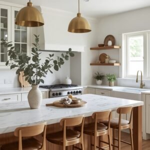A marble-topped island has a way of making a kitchen feel inherently elegant, but the styling choices around it are what determine whether it feels cold and untouchable or genuinely warm and inviting. The key is layering in natural elements that soften the stone’s formality — fresh greenery, organic textures, unfinished wood, and matte ceramics. This is the style of kitchen you see in European homes, where beautiful materials are expected to coexist with the evidence of real daily life. A marble island does not need to be pristine to be beautiful; in fact, it looks better when it is styled like someone actually cooks and lives and gathers around it.