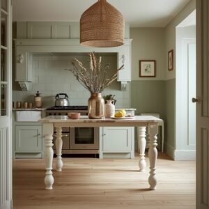 The legs are the defining feature, so choose them carefully. Turned spindle legs in a soft white or pale grey feel quintessentially English country. Tapered legs with a slight flare reference mid-century European farmhouse style. Cabriole legs bring a more formal, antique quality. Whatever profile you choose, make sure the leg height is proportionate to the island body — legs that are too short make the island look stumpy, while legs that are appropriately long give it that lifted, airy quality that makes it read as furniture. Finish the piece in a slightly chalky or matte paint — Farrow and Ball’s “Mizzle,” Benjamin Moore’s “Pale Oak,” or a washed sage green all feel appropriately soft and aged without looking grimy.