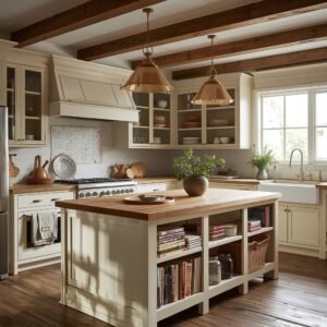 Style the top with a marble or butcher block surface to reinforce the vintage aesthetic, and layer in accessories that feel like they were gathered slowly over time rather than purchased as a set. A small mercury glass vase, a vintage-style ceramic canister, a woven basket tucked underneath between the legs — these are the kinds of details that make people stop and say the kitchen feels “charming.” Hang a simple rattan or aged brass pendant above, and pair with cross-back wooden chairs or cushioned stools that continue the furniture-as-kitchen-decor story. This island style rewards thoughtfulness in the details.