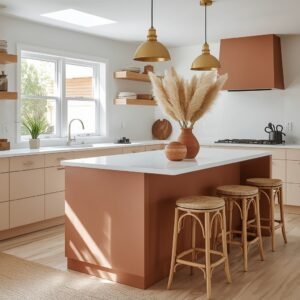 For accessories and styling, lean into the specific character of your chosen color. A terracotta island invites warm copper accents, hand-thrown pottery in cream and rust tones, and dried botanicals. A sage green island feels at home with raw brass hardware, simple white ceramics, and fresh herbs. A cobalt blue island looks beautiful against white marble and warm wood, with simple linen accessories keeping things grounded. The bar stools or chairs at the island should either echo the island color softly or stand in neutral contrast — a natural rattan or raw wood stool works with almost anything. Color on the island is only the beginning; it is the styling around it that turns it into a complete and intentional space.