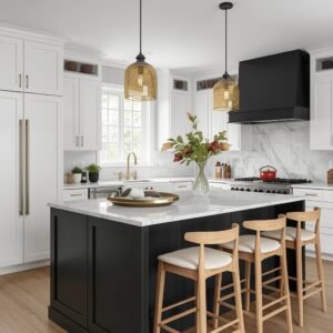 The idea of putting a black island into an otherwise light kitchen might feel bold, but it is one of those design decisions that almost always pays off. A matte or satin black island creates a striking focal point, and because it is grounded in the center of the room, it anchors the entire space without making it feel dark or heavy. Think of it the way an interior designer might think of a black accent wall — it adds drama and definition, and it makes every lighter element around it feel fresher and more intentional by contrast. In a white or pale grey kitchen, a black island has the immediate effect of making the room look more sophisticated and deliberately designed.