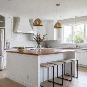 A white kitchen is timeless and bright, but it can sometimes tip into feeling a little cold or clinical if there is not enough warmth to balance it out. A rustic wood island is one of the most effective antidotes to that problem. Whether you are working with a reclaimed wood base, a live-edge countertop, or simply a painted island with a butcher block surface, the introduction of natural wood grain immediately softens the whole room. It brings in the kind of organic texture that no tile or paint can replicate — the grain, the knots, the slight variation in color that makes it feel like something that has a story. In a sea of white, it becomes the element the eye rests on.