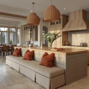 The built-in bench element requires some thought in terms of proportion. The overhang of the countertop should extend at least twelve to fifteen inches on the seating side to allow comfortable legroom, and the bench seat should be positioned so that the top of the island countertop sits at a comfortable elbow height for someone seated. Upholster the bench cushion in a performance fabric — a woven linen blend or a textured boucle in a neutral tone works beautifully and holds up to the reality of daily life. Add a row of accent pillows in complementary tones, and suddenly the bench feels less like a kitchen accessory and more like a small sofa nook that happens to be beside the stove.