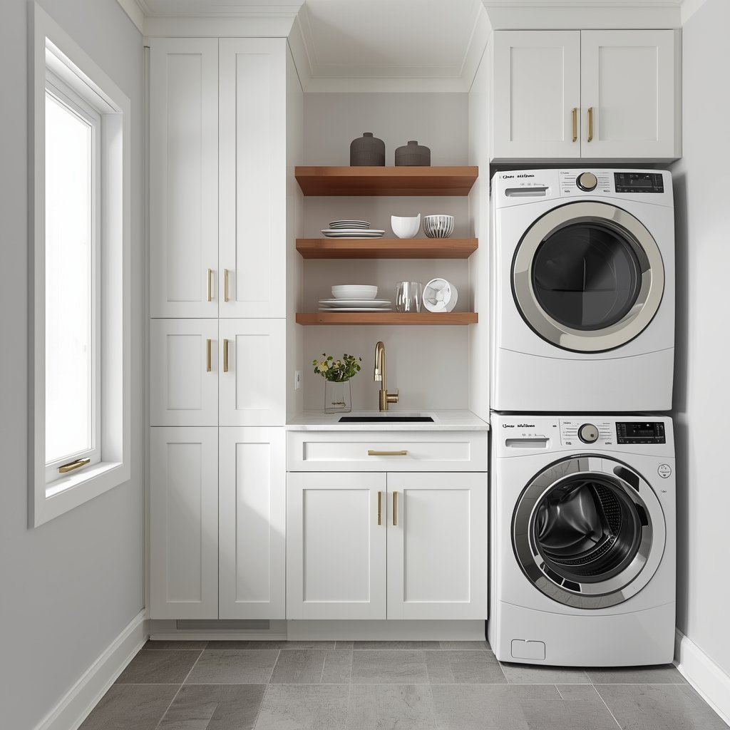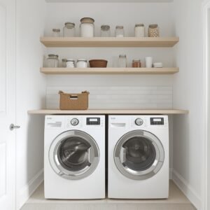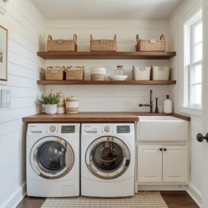 There is a reason white and wood combinations never go out of style in home design — they are clean, calming, and endlessly versatile. In a laundry room, this pairing works especially well because it brings warmth to a utilitarian space without making it feel overdone. Start with white or off-white walls, then layer in natural wood shelving above the washer and dryer. Choose open shelves over upper cabinets to keep the room feeling airy. Stack neatly folded towels or line up matching glass canisters for detergent and fabric softener. The wood tones soften the sharpness of all that white, and together they create a space that feels intentional rather than just practical.