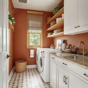 Color in a laundry room is one of the simplest and most affordable ways to completely transform how the space feels to use. A fresh coat of paint in a bold, happy tone — think terracotta orange, butter yellow, cobalt blue, or bright coral — instantly makes the room feel like it was designed with intention. The rest of the color story does not have to match exactly; contrast and complement instead. Pair a terracotta wall with warm wood shelving and cream accessories. Pair cobalt with warm brass and white cabinetry. The color becomes the personality, and everything else supports it. Do not be afraid to go for it — laundry rooms are low-risk, high-reward spaces for experimenting with color.