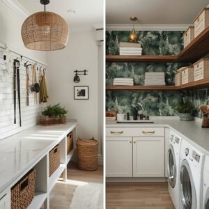 Wallpaper in a laundry room is one of those design moves that seems unnecessary until you see it done well — and then you cannot imagine the space without it. Because laundry rooms are typically small and get less traffic than other rooms in the house, they are the perfect low-commitment space to try a pattern you love but might hesitate to use elsewhere. A bold botanical print, a classic toile, a geometric tile pattern, or an oversized floral in rich, saturated color can completely redefine the space. The wallpaper becomes the art, meaning you can keep everything else relatively simple — white cabinetry, basic countertop, straightforward fixtures — and the room still feels fully designed.