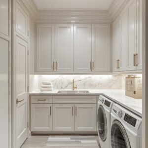 There is no rule that says a laundry room cannot feel indulgent. In fact, some of the most beautiful utility spaces in home design right now lean fully into the idea of treating functional rooms with the same level of attention as a master bathroom or kitchen. Start with a soft, neutral palette — warm white, blush, greige, or pale taupe. Install full-height cabinetry with push-to-open doors for a seamlessly clean look, and choose a countertop in veined marble or marble-look quartz that runs the full length of the room. A deep single basin sink with a gooseneck faucet in matte gold or brushed nickel elevates the whole composition immediately.