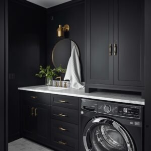 Balance the darkness with strategic light and warm-toned accents. Brass or antique gold fixtures — think light sconces, faucet hardware, or even cabinet pulls — cut beautifully through the deep tones and add a layer of sophistication. If you have room for a countertop, choose a creamy white quartz or a butcher block surface to break up the dark color and provide visual contrast. Hang a large round mirror with a thin brass frame to bounce light around the room. Keep folded linens in crisp white or warm oatmeal tones to keep the space from feeling cave-like. Done right, a dark laundry room feels like a design choice rather than an oversight.