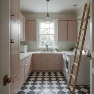 Layer in accessories that feel like they have been collected over time rather than purchased as a set. A vintage wooden ladder leaned against the wall makes a charming drying rack. Old ceramic canisters repurposed to hold clothespins, detergent pods, or dryer sheets add character and function at the same time. A pastel linen curtain under the sink hides cleaning supplies while keeping the softness of the aesthetic intact. For flooring, a classic black-and-white checkerboard in either tile or vinyl creates instant vintage personality. Choose lighting that matches the mood — a simple milk glass pendant or a vintage-style flush mount in brushed brass pulls the whole space together into something that feels curated and full of personality.