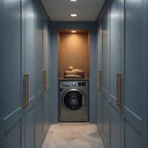 The most elegant small laundry room is often one you cannot tell is a laundry room at all. Concealing your washer, dryer, sink, and supplies behind a wall of cabinetry or a pair of bifold doors creates a sleek, uninterrupted surface that visually expands the space. This approach works especially well when the laundry area shares square footage with a hallway, mudroom, or kitchen. Panel-front appliances — where the washer and dryer faces are covered with cabinetry fronts — take this concept to its most refined level and are increasingly available through major appliance brands.