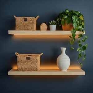 Wall color makes or breaks an open shelving setup. A soft warm white keeps things light and airy, while a moody deep tone — think navy, forest green, or charcoal — makes the natural basket textures pop dramatically and gives the room a boutique feel. Either approach works beautifully depending on the mood you are going for. Add a small trailing pothos or a eucalyptus bundle draped over one shelf edge for softness. Lighting is critical here: under-shelf LED strips or a simple plug-in sconce mounted between shelves casts warm, even light that eliminates shadows and makes the room feel inviting rather than stark.