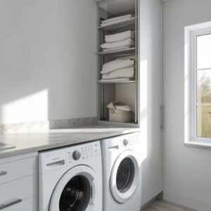 Choose your cabinet doors wisely. Flat-panel Shaker doors in a soft white or warm linen tone keep the look timeless. For a bolder statement, try a muted sage green or dusty blue — colors that read as furniture-like rather than built-in. Pair with simple bar pulls in unlacquered brass for warmth, or go sleek with touch-to-open mechanisms for a completely hardware-free look. Inside, organize with intention: a small tension rod for hanging delicates to drip-dry, adhesive hooks on the inside of the door for supplies, and a fold-down shelf that doubles as a folding surface when the cabinet is open. Closed, it looks like a beautiful linen armoire. Open, it is a fully functioning laundry station.