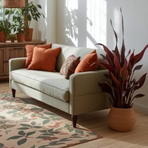 In 2026, the line between indoors and outdoors continues to blur beautifully, and nowhere is this more evident than in the nature-inspired autumn living room. This style is built on the premise that the most beautiful autumn decor comes directly from nature itself. A sofa in sage green or moss-toned linen becomes your anchor, paired with cushions in warm terracotta, mushroom brown, and cream. The floor beneath is covered in a low-pile rug with an abstract leaf or botanical print in earth tones. Rather than buying seasonal decor, think about foraging — bringing in actual branches, seedpods, pinecones, and dried leaves arranged in oversized vases.
