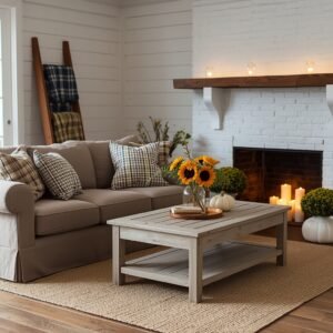 Modern farmhouse interiors and autumn decor are a match that essentially created Pinterest as we know it — and in 2026 the style is being updated with cleaner lines and more sophisticated seasonal touches. Begin with a white or soft grey shiplap accent wall as your backdrop. A linen sofa in warm white or light taupe sits in front of it, anchored by a sisal or braided wool rug. The furniture choices lean functional and sturdy — think a chunky farmhouse-style coffee table in weathered grey wood, an old wooden ladder leaning against the wall draped with blankets, and a wooden crate repurposed as a side table.