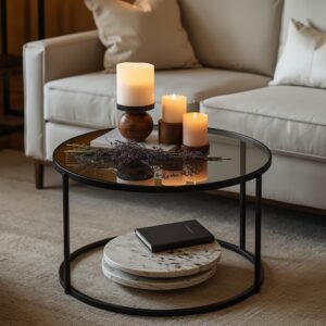 There is a reason candle clusters appear on every aspirational home decor feed — they transform the atmosphere of a room in a way that almost nothing else can. On a glass coffee table, the effect is even more dramatic because the glass reflects the flame and doubles the warmth. The approach here is to group candles in odd numbers — three or five — and vary their heights intentionally. Mix a tall pillar candle with a medium hurricane glass candle and a set of short votives. Use one cohesive color across all of them: all ivory, all terracotta, or all charcoal. Mixing wax colors in the same cluster creates visual noise rather than elegance.