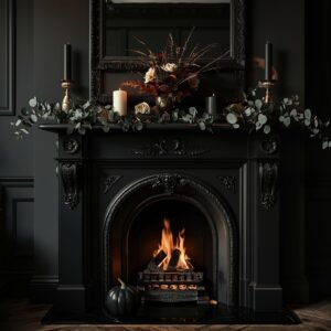 There is no better anchor for a Halloween living room than a fireplace dressed with intention. In 2026, the dark romantic aesthetic is having a full moment — think deep burgundy, black, aged brass, and dried florals working together in a way that feels grown-up and genuinely gorgeous. Start by layering your mantle with varying heights of black and ivory pillar candles in antique brass holders. Tuck in sprigs of dried eucalyptus, blackened branches, or preserved black roses between the candles to add organic texture. A large black-framed mirror above the mantle doubles the candlelight and makes the entire composition feel grander. The key here is asymmetry — resist the urge to make it perfectly symmetrical, because a slightly off-balance arrangement feels more like collected-over-time than staged.