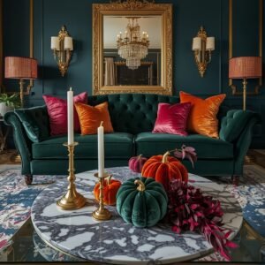 Accessorize with intention and a deliberate eye for material quality. Gold pillar candle holders of varying heights grouped on a mirrored or marble coffee table tray create a centerpiece that feels worthy of a styled shoot. Look for pumpkins in velvet, sequin, or metallic finishes — the market for these has grown significantly and they are widely available now. Deep burgundy or purple dried floral arrangements in gold vases add vertical interest on side tables or the mantle. For lighting, warm-toned candles and a dimmed chandelier or statement pendant create the amber glow that makes jewel tones look their most saturated and rich. The overall effect is Halloween-meets-New-Year’s-Eve, and it is genuinely gorgeous.