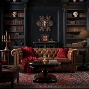 Choose a leather or faux-leather sofa in cognac brown or dark forest green as the seating centerpiece — both feel authentically Victorian and pair beautifully with dark wood shelving. Layer in a Persian-style area rug in jewel tones: deep red, gold, and navy work especially well. On your coffee table, stack three or four leather-bound or vintage-look hardcovers, add a brass magnifying glass, a wax seal set, and a single overflowing black candelabra for theatrical effect. For lighting, floor lamps with amber-toned bulbs are essential here. Overhead lighting should be dimmed or turned off entirely in favor of these warm, localized light sources. The room should feel like you are mid-chapter in a very good book on a very stormy October evening.
