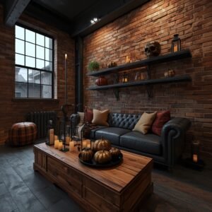 The industrial aesthetic is not typically the first thing people reach for when decorating for Halloween, but the pairing is surprisingly natural. Exposed brick, dark metal, concrete textures, and raw wood already carry an inherent moodiness that Halloween simply amplifies rather than invents. If your living room has any of these architectural features — a brick wall, concrete floors, metal-framed windows — lean into them hard this season. A leather sofa in aged cognac or charcoal anchors the space, and a rugged wool blanket in dark plaid adds warmth without softening the edge. Metal pipe candle holders and wrought-iron candelabras on the coffee table feel right at home.