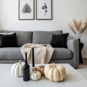 Minimalism and Halloween might sound like an odd pairing, but when executed well, it is quietly breathtaking. The idea is to strip the palette down to black, white, and soft grey while letting form and texture do all the emotional heavy lifting. A clean, modern sofa in ivory or light grey linen becomes the canvas. Against it, place three or four throw pillows in varying shades of black and charcoal — solid, tone-on-tone textured, or with a subtle geometric print. No orange pumpkins, no glitter cobwebs. Instead, white or cream-colored pumpkins line the coffee table in a simple, unfussy row. Black taper candles in sleek matte holders add drama without noise.