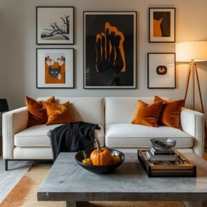 The real magic happens in the accessories, and here you give yourself full permission to pile them on. A gallery wall of bold black-and-orange Halloween prints — geometric pumpkins, abstract bats, vintage apothecary labels — arranged in mismatched black frames creates a dramatic focal point. On the coffee table, a large decorative bowl filled with black and orange ornamental balls, mini matte black pumpkins, and dried orange pomanders makes a statement centerpiece. On the floor beside the sofa, cluster three oversized real pumpkins of different shapes and heights — natural, carved, and partially dried — for organic drama. Black arch floor lamps positioned on either side of the sofa complete the composition and frame the entire setup like a fashion editorial.