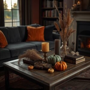 On your coffee table, build a harvest-style flat-lay using a round wooden tray as the base. Fill it with a hand-thrown ceramic mug of warm cider (or a candle that looks like one), a stack of vintage-style books, a bundle of dried wheat stalks, a few beeswax taper candles, and three or four real mini pumpkins and gourds. On the wall behind your sofa, consider hanging a simple wreath made from dried orange slices, cinnamon sticks, black ribbon, and dried rosehips — it smells as good as it looks. Neutral, warm, textured — this is the Halloween aesthetic that appeals to the person who loves fall in every form it takes and simply wants their home to feel like the most comforting place on earth in October.