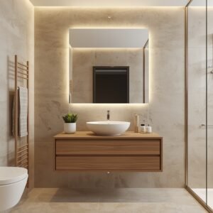 Pairing natural stone with raw wood elements takes the look even further. A floating vanity in light oak or walnut gives warmth against the cool stone and creates a beautiful contrast of organic textures. Keep the hardware minimal, maybe a single brushed nickel or matte brass pull, and keep the sink basin simple. An oval or round undermount sink in matte white or raw concrete keeps the lines clean. For lighting, consider a backlit mirror for a soft, glowing effect that highlights the texture of the stone wall beautifully. Add a small natural loofah, a wooden soap dish, or a single succulent in a ceramic pot to complete the look. These tiny details make the space feel lived-in and real.