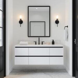 Texture is important in a black and white minimalist bathroom to keep it from feeling flat. A white ribbed ceramic vase on the vanity, a textured white bath mat, a matte black tap with an interesting silhouette — these small details create visual interest without adding color. A large matte black framed mirror makes a strong statement above the vanity and works as the visual anchor of the whole design. For lighting, go with warm white bulbs rather than cool ones. Cool light in an all-white bathroom can feel harsh, while warm light softens everything and makes the space feel more inviting. A simple black wall sconce on either side of the mirror is all you need.