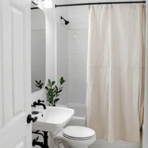 Paint is the most budget-friendly tool you have. A fresh coat of warm white or soft sage on the walls immediately lifts the whole bathroom. If you cannot retile, consider a large shower curtain in linen or waffle cotton — it draws the eye and adds instant texture and style. Replace your old bath mat with a natural cotton or stone-grey woven one. Get a matching set of ceramic accessories: a soap dispenser, a small dish, a cup for toothbrushes. Add one small plant, a trailing pothos or a small succulent, and suddenly your bathroom tells a very different story. These small, thoughtful changes build on each other and create a cohesive, calm minimalist bathroom without a full renovation or a large budget.