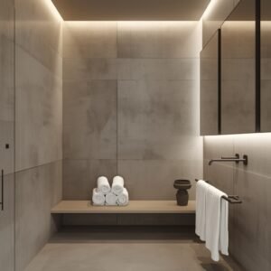 Balance the concrete with warm wood and soft white linens. A light timber floating shelf above the vanity, a wooden bath tray across a freestanding tub, and thick white cotton towels folded neatly on a wall rail all soften the industrial edge of concrete beautifully. A matte brass tap and matching towel rail add a luxurious warmth that complements the raw texture of microcement perfectly. Keep decor extremely minimal: a single ceramic vase, a dark green plant like a snake plant or fern, and nothing else. The concrete surface is so visually interesting that it truly does not need much decoration. For lighting, long horizontal warm white LED strips recessed into the ceiling or around the mirror give the space a very modern and clean finish.