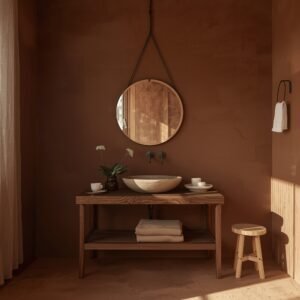 Japandi is the beautiful blend of Japanese and Scandinavian design, and it creates some of the most serene minimalist bathrooms you will ever see. The philosophy is simple: only keep what serves a purpose, and find beauty in natural imperfection. In a Japandi minimalist bathroom, you will see a lot of raw textures, earthy tones, and organic shapes. Think a hand-thrown ceramic basin in an uneven, artisan shape. Think rough plaster walls in a warm clay or putty tone. Think floor tiles that mimic the texture of natural stone but with a slightly imperfect, handmade feel. These are the details that give a Japandi bathroom its soul.