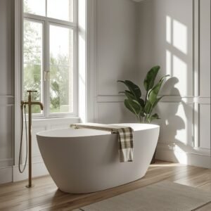 Keep the rest of the bathroom very intentionally simple when you have a freestanding tub as the hero. A pared-back vanity, a simple frameless mirror, a floor-mounted freestanding tap in brushed brass or polished chrome — these are all the supporting characters need. Do not over-decorate around the tub. A simple wooden bath tray with a candle, a book, and a small glass of water is enough. A fluffy bath mat in natural cotton placed in front of the tub and a single large plant like a fiddle leaf fig or monstera in the corner add life and softness. The whole effect should feel like a personal spa that is quietly beautiful and completely calming.