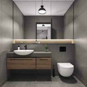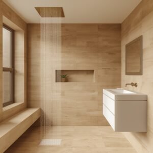 Warm minimalism is the style for people who love a clean space but cannot live without a sense of coziness. It is all about balancing the simplicity of minimalism with materials that feel genuinely warm and human. Light wood is the hero here. A floating vanity in natural oak, a teak wood bath mat, a small wooden shelf above the toilet — these details shift the energy from cold and clinical to calm and welcoming. Pair wood tones with soft plaster-effect walls in warm sand or greige, and you instantly have a bathroom that feels like a boutique hotel in the best possible way. Stick to a very light wood tone rather than dark walnut to keep the space feeling airy.