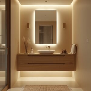 Soft, layered lighting is what makes a warm minimalist bathroom truly magical. Avoid a single overhead light if you can. Instead, use a backlit mirror combined with a small bedside-style table lamp on the vanity or a wall sconce at a lower height. This multi-source lighting approach creates a warm, golden glow that feels much more inviting than flat overhead lighting. Layer textures with a chunky linen towel, a round woven basket for storage, and a small ceramic tray holding a candle and a bar of soap. These are the details that feel curated and intentional without looking overdone. The mood you are going for is serene, warm, and simple — like a slow Sunday morning.