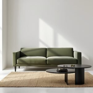 In minimalist design, restraint allows one carefully chosen piece to carry the entire room. The statement sofa approach leans fully into this idea. Choose a sofa in a quiet but impactful color — deep sage green, dusty slate blue, or rich charcoal — and let it be the undeniable focal point of the space. Every other element in the room then steps back and plays a supporting role. Walls stay white or very light. The floor remains neutral. Accessories are reduced to the absolute minimum. The sofa is the art. This works best with a sofa that has a clean, architectural silhouette — no fussy curves, no busy detailing, just a strong, confident shape in a beautiful color.