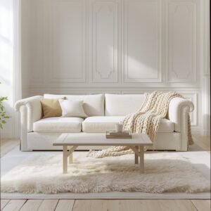 White on white sounds risky, but in practice it is one of the most sophisticated directions a minimalist living room can take. The key is texture. Without it, an all-white room reads flat and clinical. With it, every surface becomes interesting. Start with a white or off-white wall and pair it with a sofa in a slightly warmer shade — a creamy white bouclé works beautifully here. Then layer in a fluffy ivory area rug underfoot, and introduce a knitted white throw draped casually over the sofa arm. Each piece is technically the same color family, but the variation in material — smooth plaster, nubby bouclé, woven rug — creates visual rhythm that keeps the eye moving.