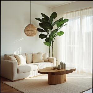 Natural materials amplify the biophilic effect throughout the room. A live-edge wooden coffee table brings an irregular, organic form that contrasts beautifully with the clean lines of minimal furniture. A woven rattan floor lamp adds texture and warmth without introducing color. Stone coasters, a small piece of driftwood, or a ceramic pot made to look like raw earth all reinforce the natural material language. Keep the plant count intentional — two or three statement plants rather than a crowded jungle. The space should breathe. The goal is for nature to feel like it belongs here, not like it was arranged for a photo. Paired with sheer curtains and plenty of daylight, this is a living room that genuinely feels restorative.