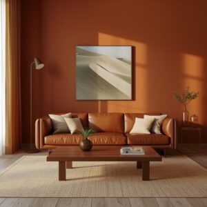 Minimalism does not have to live in a cold, stark world of greys and whites. Warm minimalism is a growing approach that leans into earthy, nature-inspired tones while keeping the space edited and intentional. Think terracotta, sandy beige, burnt sienna, and muted clay — applied sparingly but with real intention. A terracotta-toned wall paired with a low-profile sofa in camel or tan leather immediately creates warmth without complexity. The furniture stays minimal in silhouette, but the color adds soul. Layer in a textured wool rug in sand or rust tones, and you have a room that feels both grounded and stylish. This is minimalism for people who find all-white rooms a little too cool for their taste.