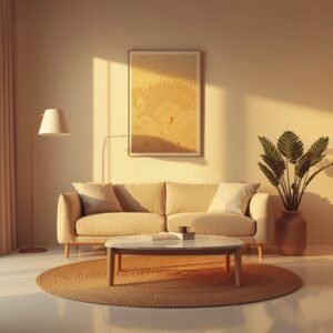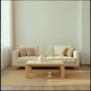 Once the base is established, focus on subtle variation within your neutral palette. Layer a slightly darker cream throw blanket over one arm of the sofa, or introduce a soft beige boucle cushion to add textural depth without introducing new color. A single matte-finish side table in warm birch wood adds warmth at eye level. Keep the walls bare for now — one well-chosen art piece can come later. Natural daylight will shift these tones beautifully throughout the day, making the room feel alive without any added decoration. This is the quiet confidence of minimalism: it never needs to shout.