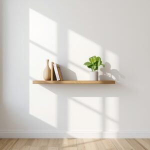 When floor space is limited, vertical space becomes your most valuable design tool. The floating shelf approach in minimalist living rooms uses walls intentionally, turning vertical surfaces into curated displays that draw the eye upward and create the illusion of more space below. The key word here is curated. A floating shelf works only when every object on it has been chosen carefully. Think: one ceramic vase, one small framed print leaning against the wall, a single trailing plant, and perhaps one or two books positioned horizontally with purpose. The shelf itself should be simple — a clean plank in pale oak or white-painted MDF, with no visible brackets or very slim ones that disappear against the wall.