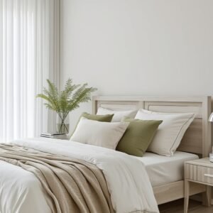 That said, a light palette does not mean boring. Layering textures within the same tonal family is what keeps the look from feeling flat. Imagine warm white walls paired with a linen duvet, a chunky cream knit throw, a whitewashed wood headboard, and sheer cotton curtains — each element is technically the same color family, but the mix of textures creates richness and depth. You can introduce a single accent color through a few carefully chosen accessories: a sage green plant, a terracotta candle holder, or dusty blue reading cushions. These small pops of color feel curated rather than overwhelming, and they can be easily swapped out as your style evolves.